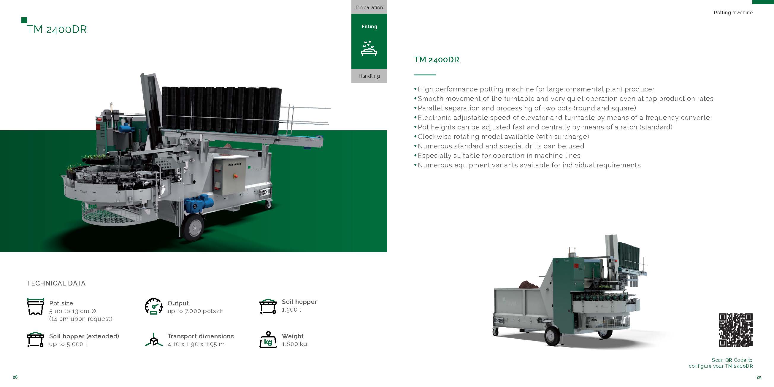 新型上盆機(jī)TM 2400DR再次將創(chuàng)新技術(shù)與人體工程學(xué)相結(jié)合。變頻控制的旋轉(zhuǎn)臺(tái)和升降機(jī),通過(guò)工作區(qū)域的面板控制,操作簡(jiǎn)單,產(chǎn)量輸出精確。新型的基質(zhì)倉(cāng)結(jié)構(gòu)確保了更高的效率。這種結(jié)構(gòu)可防止在輸送基質(zhì)時(shí)形成通道阻塞,并且無(wú)需人工干預(yù)。