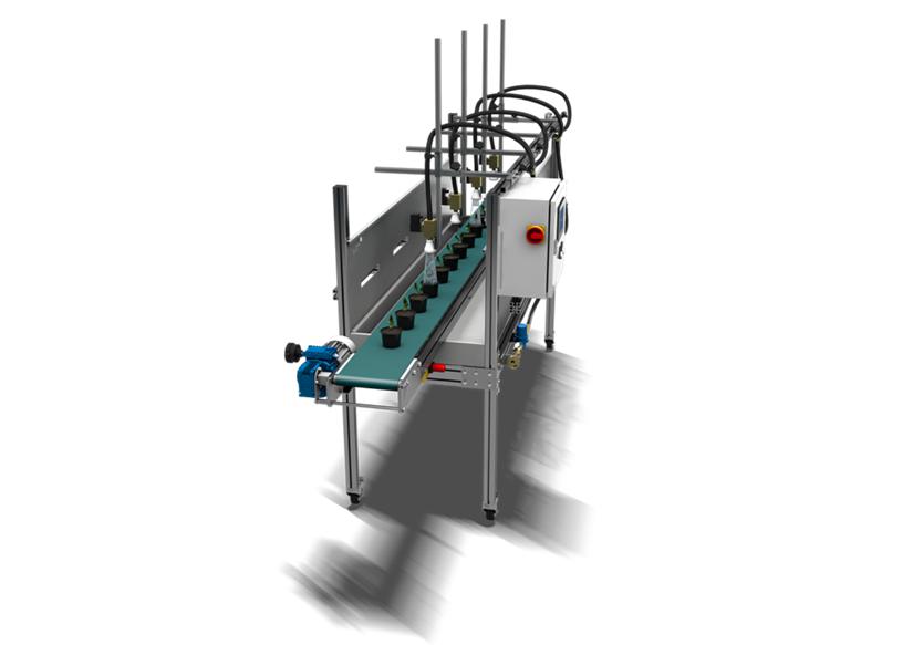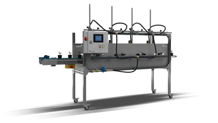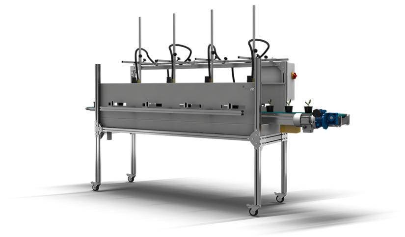 它可集成在自動上盆機(jī)和物流系統(tǒng)之間運(yùn)輸過程之間,在灌溉通道的傳送帶上,對剛剛種植的圓形和方形花盆實(shí)施精確澆水。